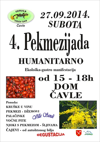 U subotu, 27. rujna 2014.g. u Domu kulture Čavle održava se humanitarno elekološka-gastro manifestacija 4. Pekmezijada. Izdvojeno iz ponude : kruške u vinu pekmezi - đžemovi palačinke voćne pite njoki s pekmezom - šljivama čajevi od autohtonog bilja Posjetite nas u Domu kulture Čavle, 15:00 - 18:00 sati Općina Čavle , TZ Čavle, Udruga vidov san