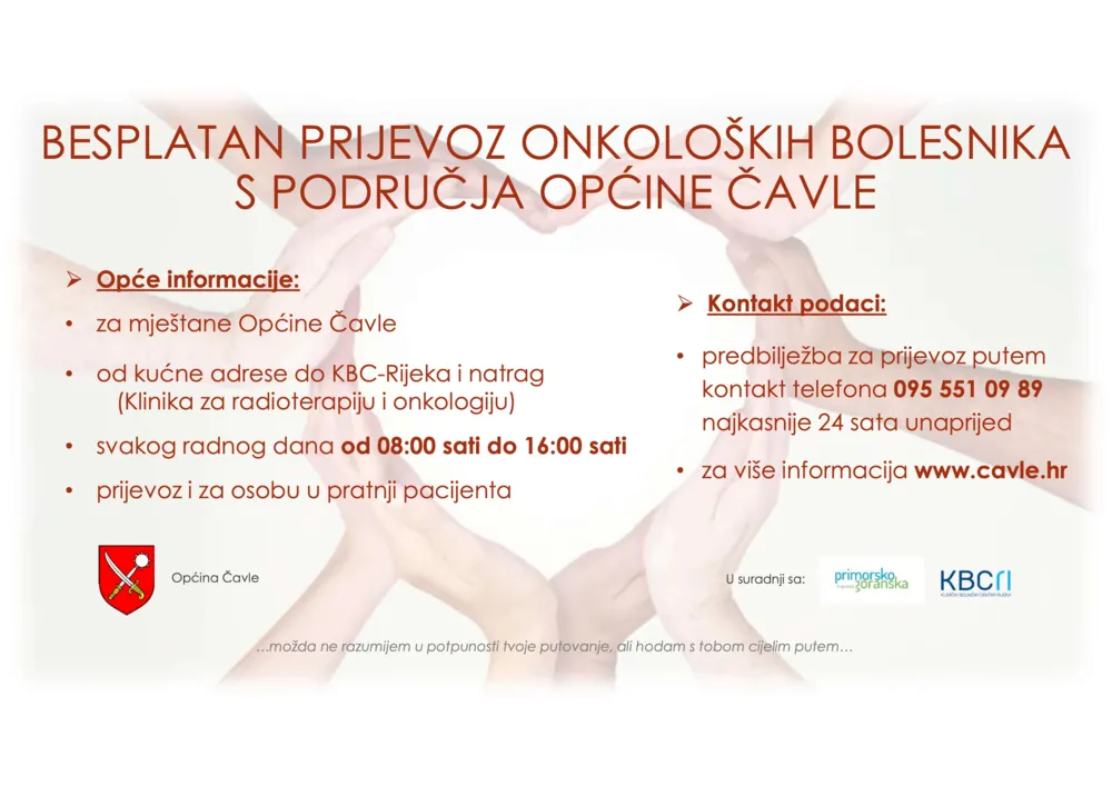 Besplatan prijevoz onkoloških pacijenata s područja Općine Čavle sufinancira Primorsko-goranska županija, temeljem prijave Općine Čavle na „Javni poziv za sufinanciranje programa prijevoza onkoloških pacijenata na terapiju iz jedinica lokalne samouprave s područja Primorsko-goranske županije u 2025. godini“.