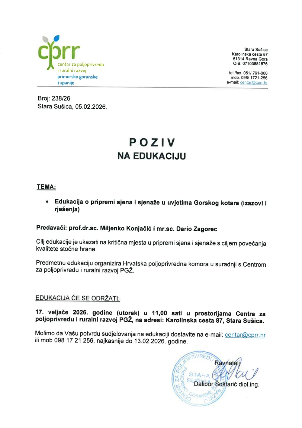 Centar za poljoprivredu i ruralni razvoj - poziv na edukaciju