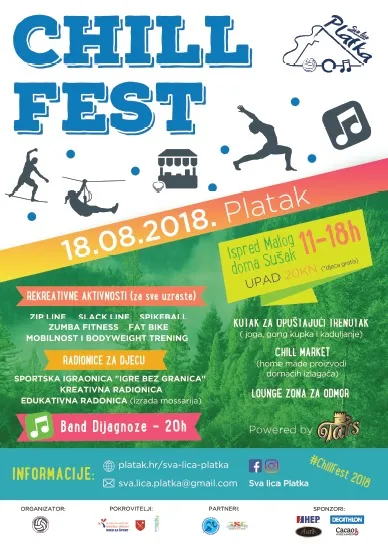 Sva lica Platka 2018. – summer edition 2018. Nakon prošlogodišnjeg pilot projekta ove godine sportsko – turistička manifestacija „Sva lica Platka“ vaća se 18.8.2018. u obogaćenom izdanju s dva programa - #SportFest i ChillFest. Projektom se želi promicato rekreativni sporta, druženje te zabava uz raznovrsne aktivnosti u prirodi za sve uzraste na Platku, kao ideale lokacije za cjelodnevne ljetne sportsko-rekreativne te zabavne sadržaje. Program se sastoji od od SPORT FESTA koji počinje u 10 sati na parkingu i CHILL FESTA koji se održava od 11 do 18 sati ispred Malog doma Sušak. SportFest program: Turnir u odbojci na pijesku, Turnir u nogometu Turnir u cageballu Turnir u košarci 3v3 Disc-golf Tubing kup Bike đir Možete se prijaviti za natjecanje putem online prijavnica: Košarka - https://goo.gl/forms/mx1g706TUSH8DrPi1 Odbojka - https://goo.gl/forms/tJ0WVqjCAGJJPq1z2 Nogomet - https://goo.gl/forms/eqKq8BBo0SRPOBRd2 Cageball - https://goo.gl/forms/zSZ51kk7tX3tDCfZ2 Disc golf- https://goo.gl/forms/ks799xJRYTnBNdrv2 Najuspješnije ekipe očekuju nagrade!!! ChillFest program Kutak za opuštajući trenutak (joga, kaduljanje, gong kupka) Chill market – predstavljanje domaćih izlagača različitih proizvoda Sportska radionica za djecu – Igre bez granica Kreativna radionica za djecu – izrada medalja od drva Edukativna radionica za djecu – izrada mossarija Lounge zona za odmor Prezentacijski sportovi: zip-line, slack-line, spikeball Snatch plesna zona Be fit bodyweight i mobilty zona Fat bike - prezentacija Večernja zabava zagarantirana je u band Dijagnoze,a počinje već od 20 sati! Sve informacije o manifestaciji možete pratiti na: http://platak.hr/sva-lice-platka/ te facebook događajima Sva lica Platka #SportFest i #ChillFest ili nas kontaktirati e-mailom na sva.lica.platka@gmail.com