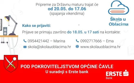 IVANA CVITAN POLIĆ: Maturantima pomažemo u ostvarivanju njihovih snova i upisu na željeni fakultet Za maturante stiže stresno razdoblje priprema za državnu maturu, budući da ocjene ostvarene na maturi mogu biti presudne pri upisu na željeni fakultet. Zbog toga je Općina Čavle odlučila pomoći svojim maturantima u pripremama za državnu maturu. Projekt je pokrenut pod sponzorstvom Erste banke i u suradnji s online platformom za poduke Škola u Oblacima. „Želja i cilj projekta je pružiti maturantima financijsku pomoć za što bolju pripremu ovog, za njih važnog završnog ispita te im i na taj način biti podrška u daljnjem obrazovanju i ostvarivanju njihovih snova“, rekla je načelnica Općine Čavle Ivana Cvitan Polić. Na program priprema za državnu maturu u trajanju od 36 sati mogu se prijaviti svi maturanti s prebivalištem na području općine Čavle završno sa 18.05. u 17 sati. Pripreme će se provoditi vikendima od 20.05. do 17.06 i to iz matematike, hrvatskog i engleskog jezika. Satovi će se održavati online, potpuno interaktivno, a rad će biti organiziran u malim grupama s do maksimalno pet učenika i profesorom. Na taj način omogućit će se individualizirani pristup svakom maturantu. Cijena programa za maturante je samo 450 kuna, dok Općina Čavle pripreme svakog maturanta subvencionira s 1.100 kuna. Više informacija o prijavama i programu nalazi se na službenim stranicama Općine Čavle i Škole u oblacima, a maturanti se mogu prijaviti preko e-maila: skola@skolauoblacima.hr ili telefonom na brojeve 095-442-1442 (Marina) i 099-271-7666 (Ema).