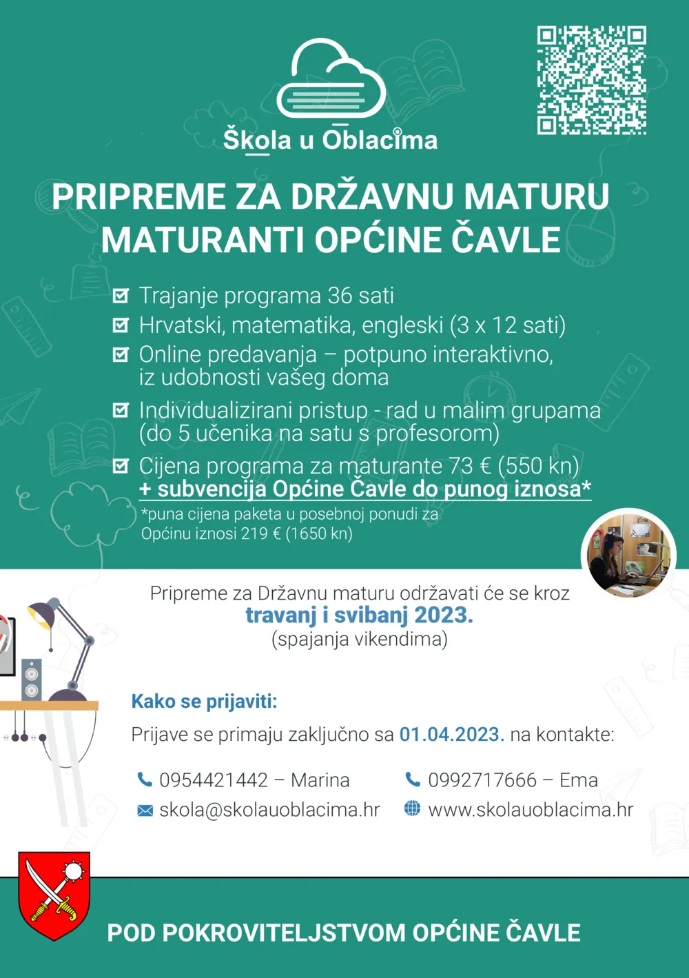 Svake godine iznova, za svaku novu generaciju maturanata, polaganje državne mature i upisi na željeni fakultet predstavljaju veliki stres. Stoga je Općina Čavle i ove godine, već drugu godinu za redom, odlučila pomoći svojim maturantima u pripremama za državnu maturu. Projekt je pokrenut u suradnji s online platformom za poduke Škola u Oblacima. „Motivirani dobrim prošlogodišnjim odazivom i još boljim rezultatima polaznika, odlučili smo i ove školske godine pružiti našim čavjanskim maturantima financijsku pomoć za što bolju pripremu ovog, za njih važnog završnog ispita te im i na taj način biti podrška u daljnjem obrazovanju i životu.“ Na program priprema za državnu maturu u trajanju od 36 sati iz matematike, hrvatskog i engleskog jezika mogu se prijaviti svi maturanti s prebivalištem na području Općine Čavle do 01. travnja 2023.g. Pripreme će se provoditi vikendima tijekom travnja i svibnja. Satovi će se održavati online, potpuno interaktivno, a rad će biti organiziran u malim grupama s do maksimalno pet učenika i profesorom. Na taj način omogućit će se individualizirani pristup, kako bi što bolje zadovoljili individualne potrebe polaznika. Cijena programa za maturante iznosi 73,00 € po maturantu, dok razliku do pune cijene u iznosu 219,00 € subvencionira Općina Čavle. Više informacija o prijavama i programu nalazi se na službenoj stranici Škole u oblacima, a maturanti se mogu prijaviti preko e-maila: skola@skolauoblacima.hr ili telefonom na brojeve 095-442-1442 (Marina) i 099-271-7666 (Ema).