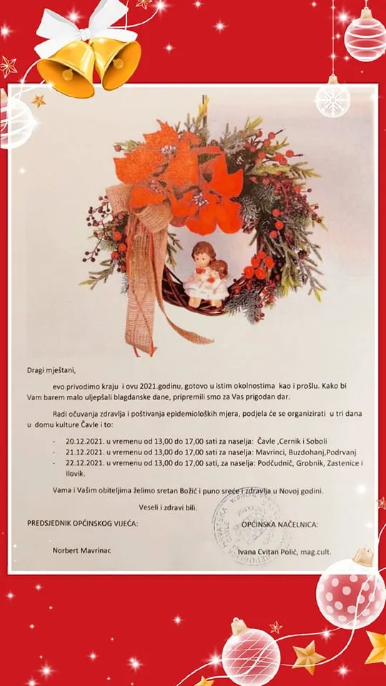 Od ponedjeljka do srijede u periodu od 13 do 17 sati u Domu kulture Čavle bit će organizirana podjela poklon paketa za umirovljenike. Pozivi su poslani poštom, a pakete se podiže uz predočenje osobne iskaznice. Pravo na poklon paket imaju mještani stariji od 70 godina (1 po kućanstvu). Podjela će biti organizirana na ulazu u Dom uz poštivanje svih epidemioloških preporuka.